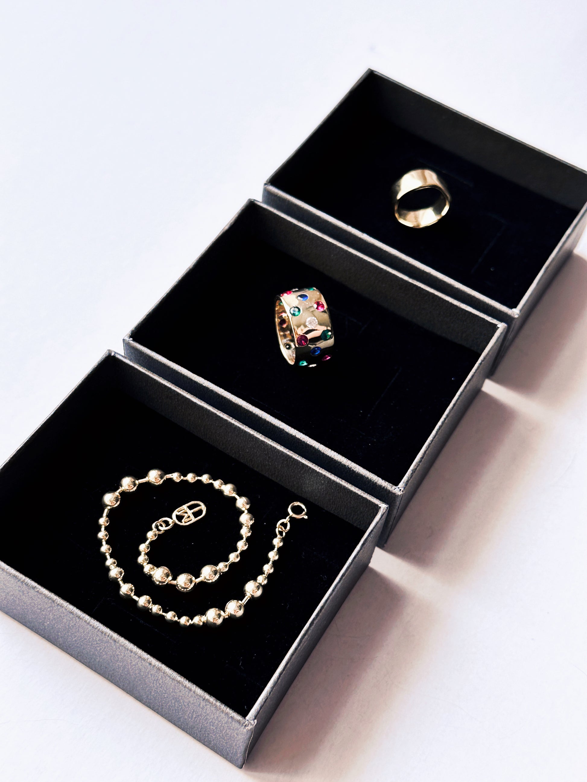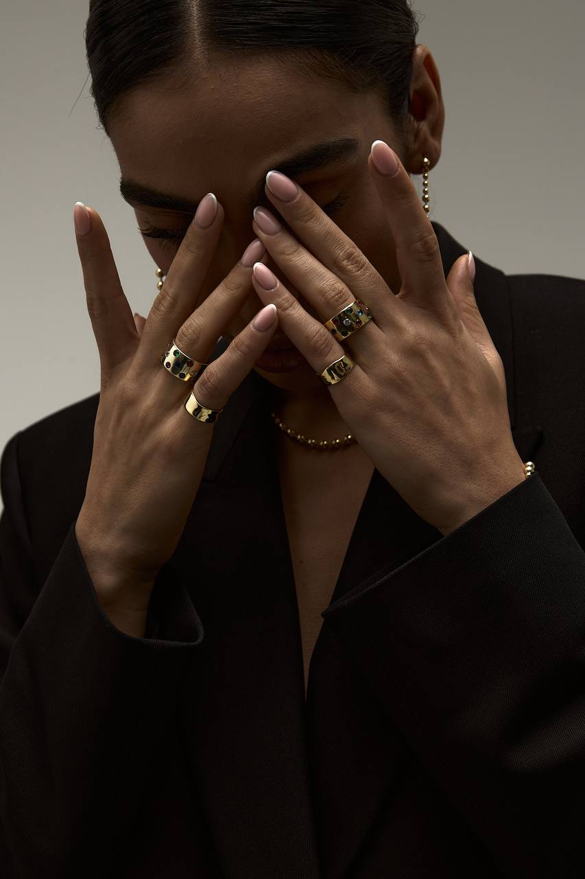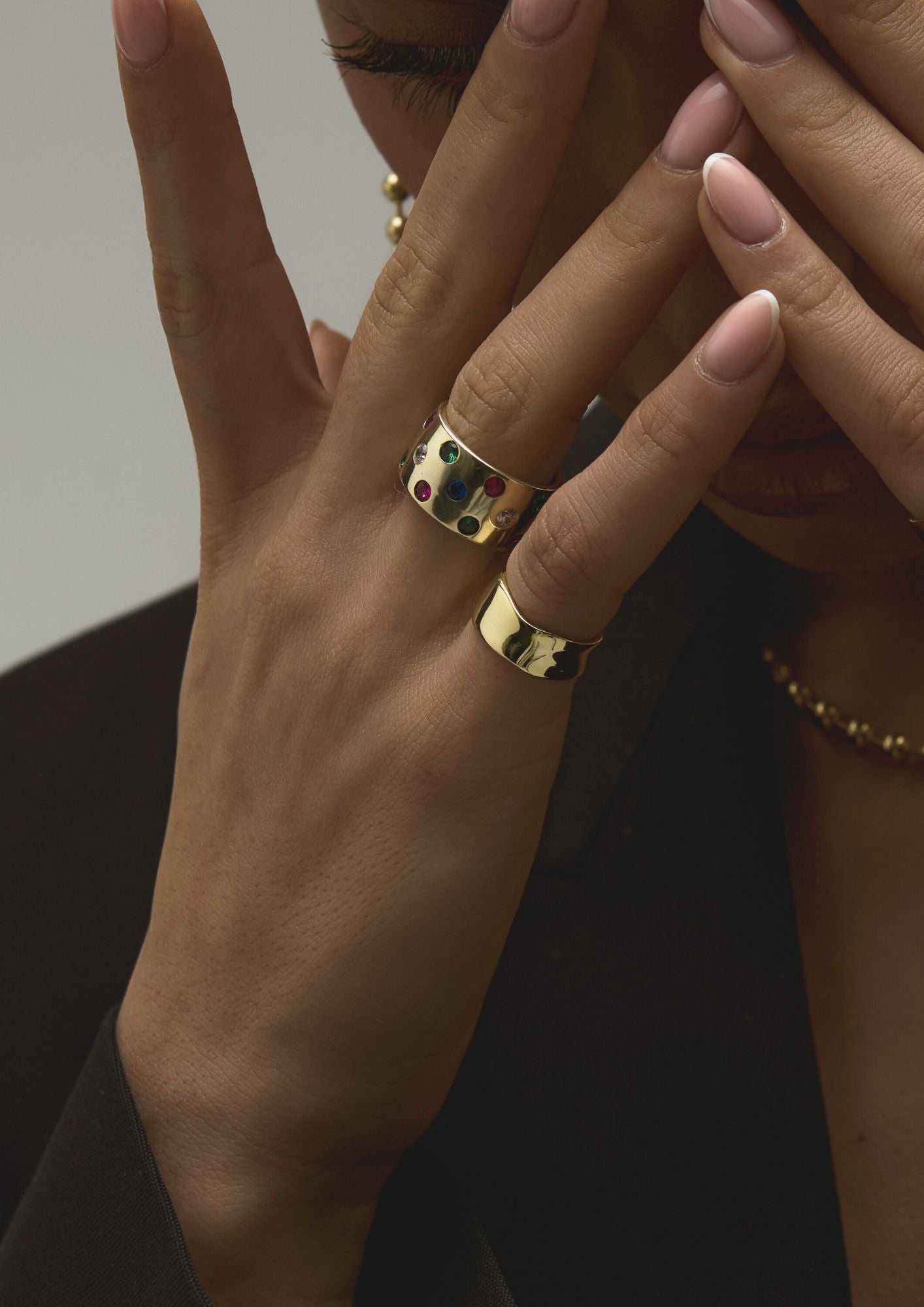 Discover the perfect balance of boldness and elegance with this wide statement ring from Moss Jewellery, a renowned brand known for its exquisite designer jewelry. This massive ring is crafted from 925 sterling silver and enhanced with a luxurious 14-karat gold plating, giving it a radiant and sophisticated finish. The design features an array of high-quality cubic zirconia stones in four stunning colors: green, deep blue, clear, and red. These colorful gemstones are expertly arranged to create a harmonious and vibrant look that is both striking and timeless.