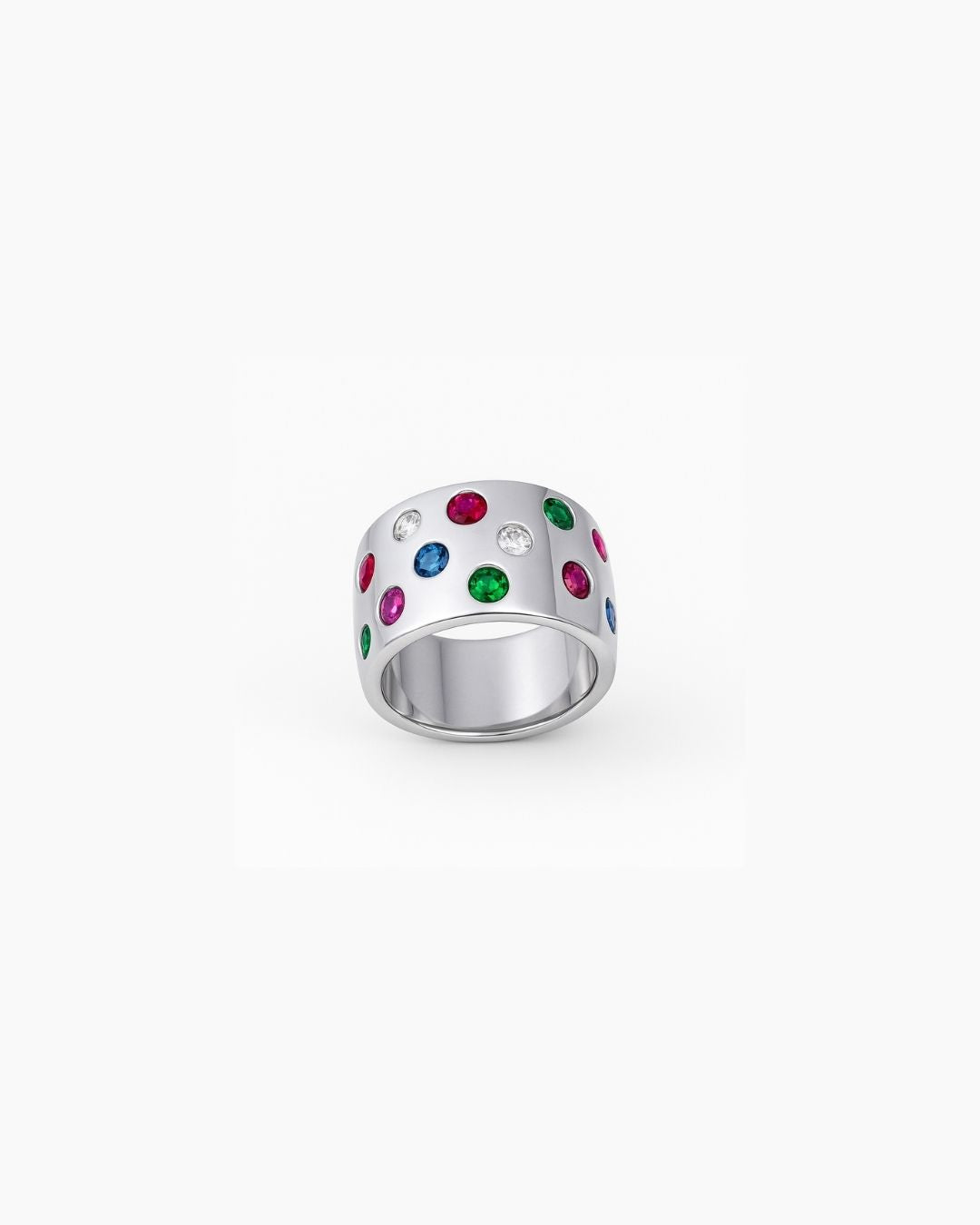 Discover the perfect balance of boldness and elegance with this wide statement ring from Moss Jewellery, a renowned brand known for its exquisite designer jewelry. This massive ring is crafted from 925 sterling silver and enhanced with a luxurious 14-karat gold plating, giving it a radiant and sophisticated finish. The design features an array of high-quality cubic zirconia stones in four stunning colors: green, deep blue, clear, and red. These colorful gemstones are expertly arranged to create a harmonious and vibrant look that is both striking and timeless.