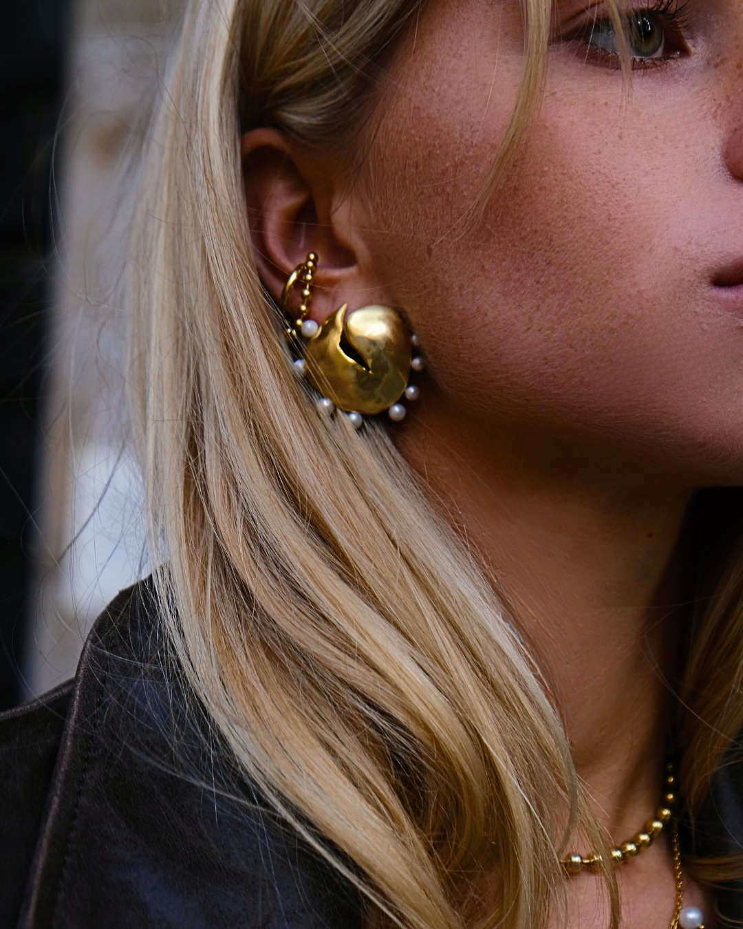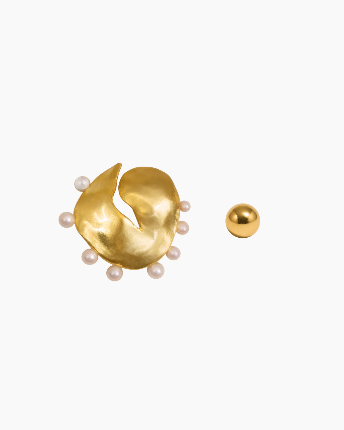 Zarif kıvrımlarla tasarlanmış ve küçük incilerle süslenmiş büyük, heykelsi küpe; minimalist altın top küpe ile kusursuz bir kontrast oluşturur.